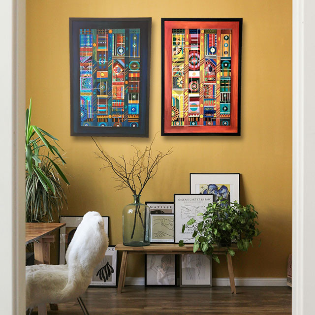 Non-figurative, non-representational art created by colors, lines, shapes & forms. Can be used singularly on in tandem.