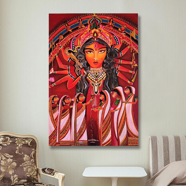 A vibrant Bengali hindu tradition is depicted in this painting, where married hindu women, dressed traditionally in saree, apply sindoor to the Goddess 's feet & forehead and then apply it to each other.