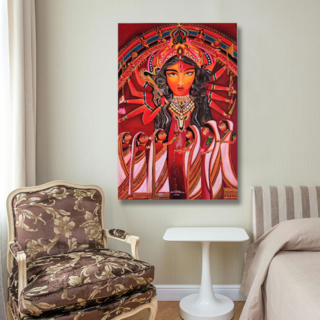 A vibrant Bengali hindu tradition is depicted in this painting, where married hindu women, dressed traditionally in saree, apply sindoor to the Goddess 's feet & forehead and then apply it to each other.